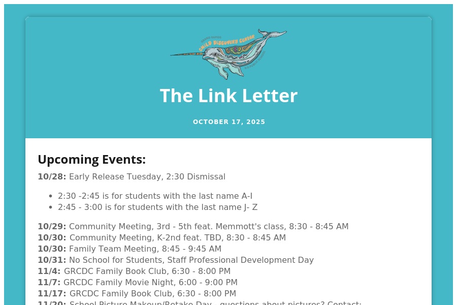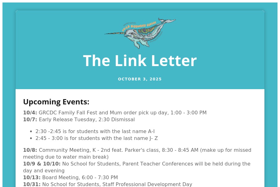 The Link Letter October 3, 2025 Upcoming Events: 10/4: GRCDC Family Fall Fest and Mum order pick up day, 1:00 - 3:00 PM 10/7: Early Release Tuesday, 2:30 Dismissal 2:. . .